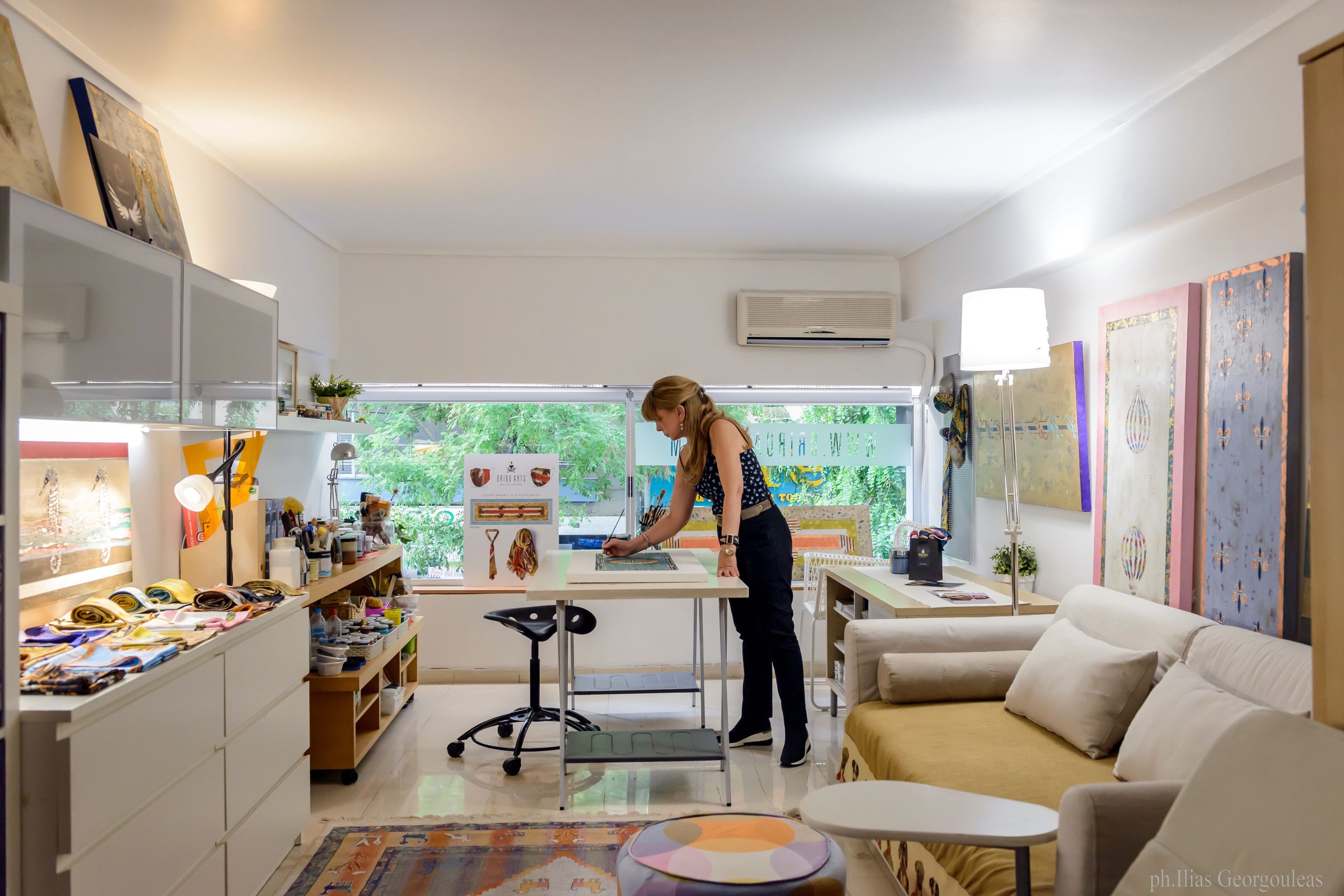 Next, we infuse this art onto the finest Greek organic silk from Soufli, Greece, transforming it into a luxurious accessory. Every season, we release four exclusive paintings that are transformed into clothing, ensuring that our customers always have access to the latest in fashion and art.